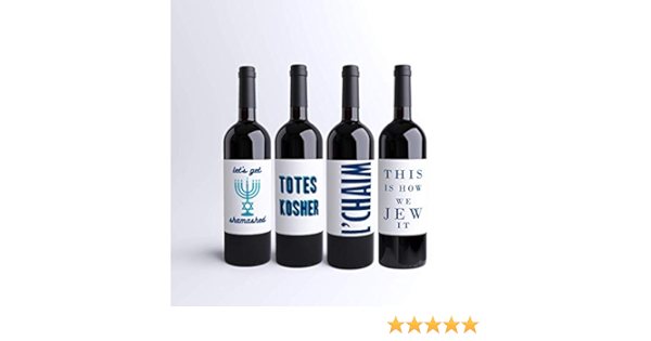 Hanukkah Wine Labels Funny Jewish Wine Bottle Labels (Pack of 4) Holiday Dinner Party Custom Printed Wine Labels | Chanukah Party | Menorah Let's Get ...